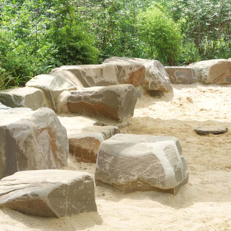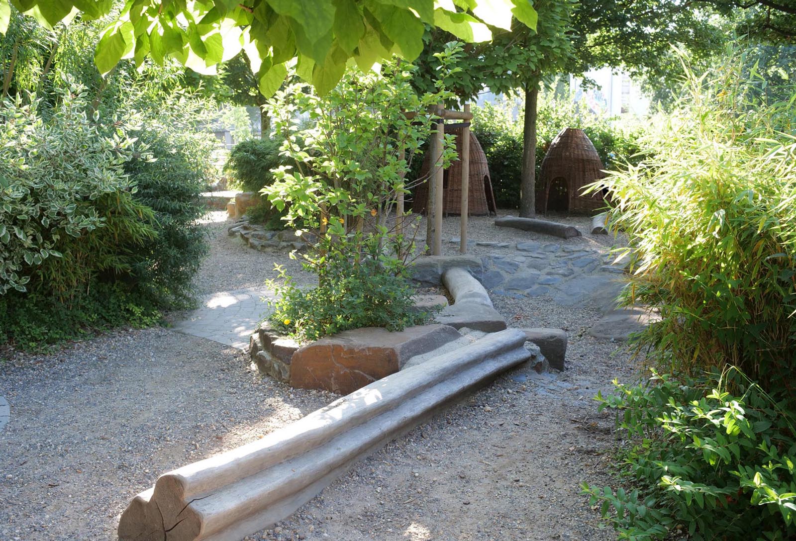 “Wir können fliegen!” Durch den Einsatz von Naturstein, unterschiedlichen mineralischen Mischungen und Hölzern wurden analog natürlichen Situationen, Spielorte wie Lichtungen, Sandbecken, Pfade und Schleichwege gestaltet und mit Weidentipis und Hütten ergänzt. Gezielt wurden dabei neben dauerhaften Materialien wie Felsen und Robinienhölzern auch Materialien eingeführt, die Wandlungs- und Verwitterungsprozesse zeigen, um die Kinder an den natürlichen Transformationsprozessen teilhaben zu lassen.